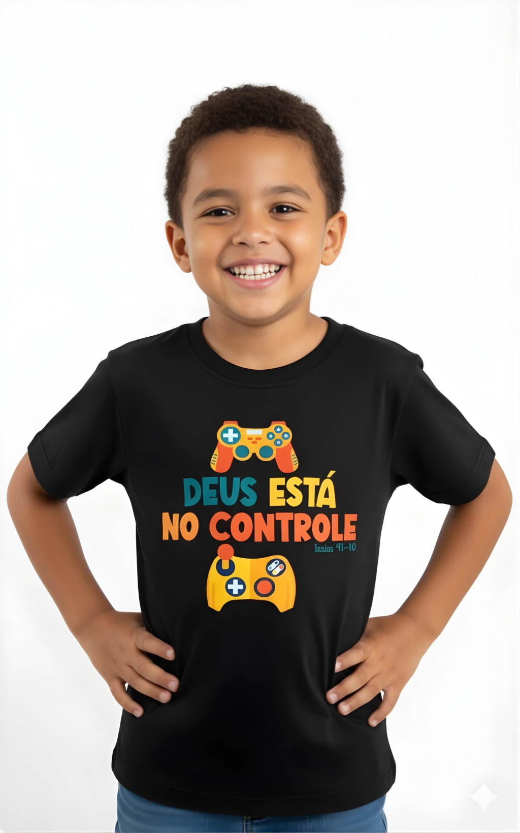 A camiseta Infantil Deus Está No Controle expressa de uma forma divertida e lúdica para crianças e jovens que amam o mundo dos games, o quanto Deus está no comando de nossas vidas.