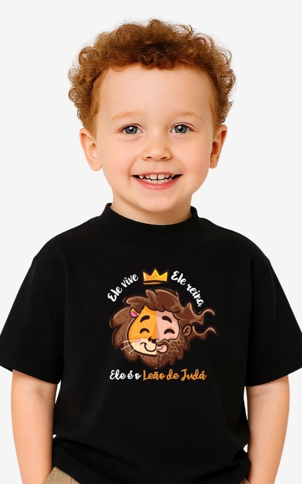 A camiseta infantil Ele é o Leão de Judá é uma peça que declara que Jesus, vive e reina sobre nossas vidas, sendo o leão de nossa tribo.